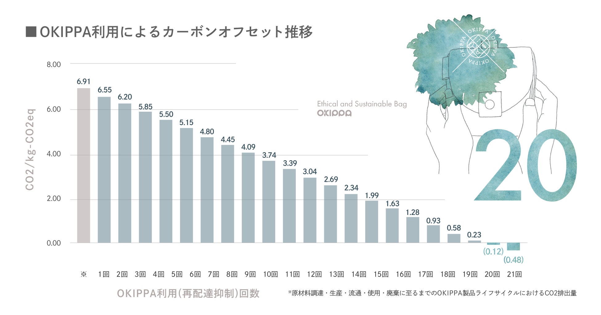 2020年12月に一般社団法人サステナブル経営推進機構(SuMPO)の監修のもと実施、製品ライフサイクルにおける二酸化炭素(以下CO2)排出削減効果を算出しました。LCAの結果、OKIPPAを使って再配達を削減した回数が利用者1人あたり20回を超えた時点で、OKIPPA1個分の製造や流通、廃棄の過程でのCO2排出がオフセットされ(カーボン・オフセット )、カーボンニュートラルとなることが証明されております。