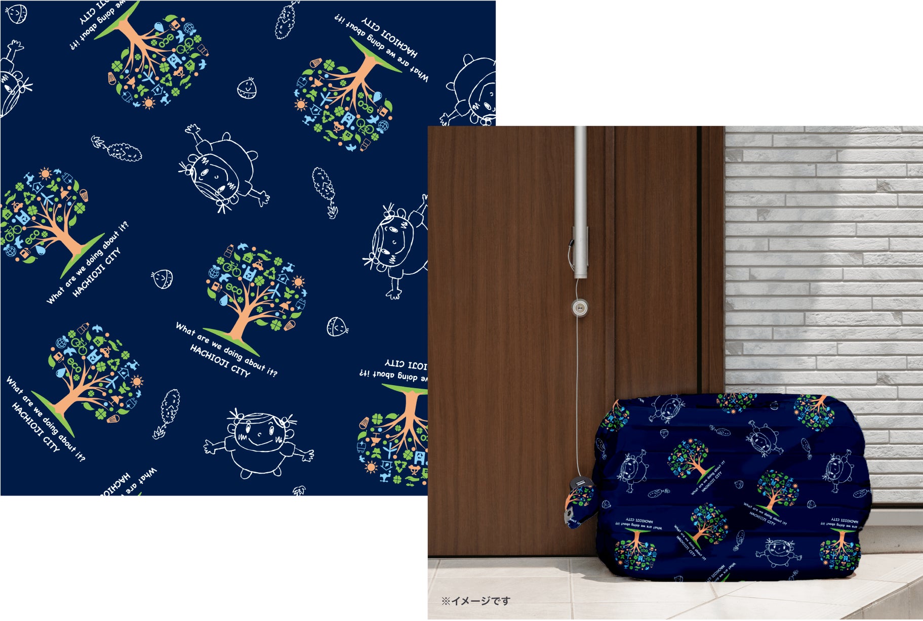 今回のOKIPPAは八王子市オリジナル柄となり、サステナブルなイメージの木々の間に、はちおうじ省エネ国キャラクターのえこちゃん、グリちゃん、ゴーくんが描かれており、毎回の荷物受け取りが楽しみになるようなかわいいデザインになっています。